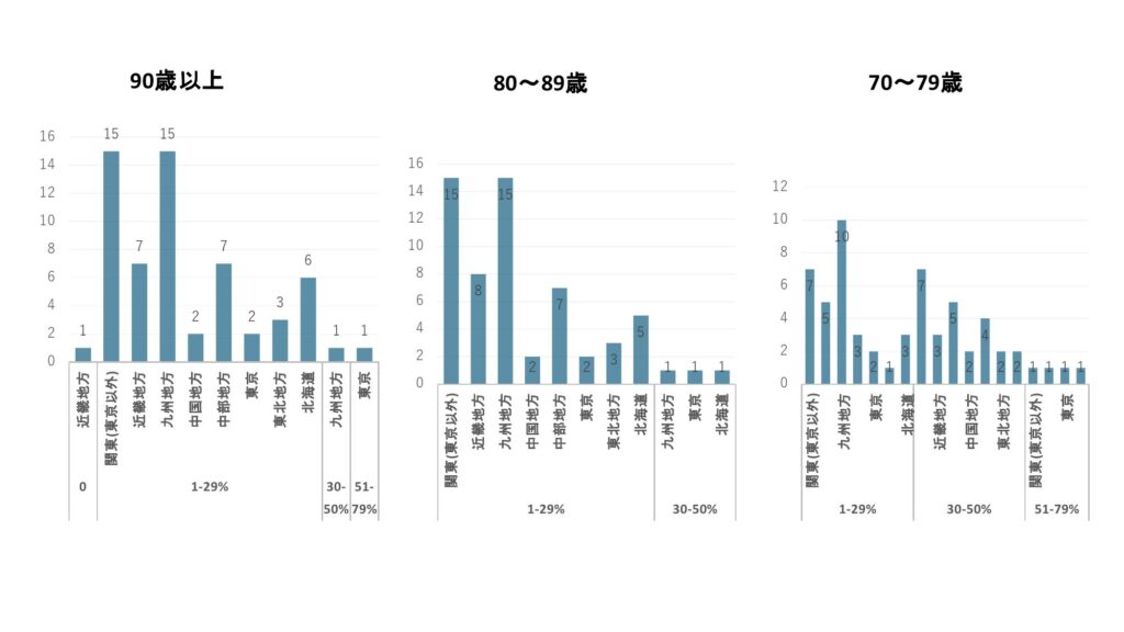 回答施設において、70歳代の患者が「30%未満」、「30~50%」と答えた施設はそれぞれ51%、42%であった。80歳代は95%、90歳代は96%の施設が「30%未満」と回答した。地域別では、九州地方および東京都の各1施設が80歳代、90歳代が「30%以上」と回答した。 - 認知機能評価の実施状況