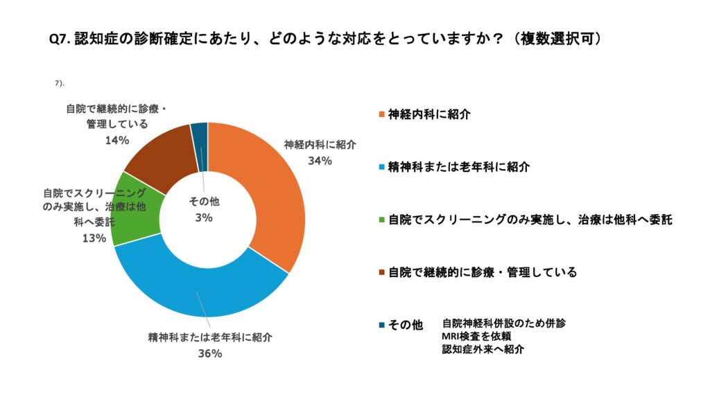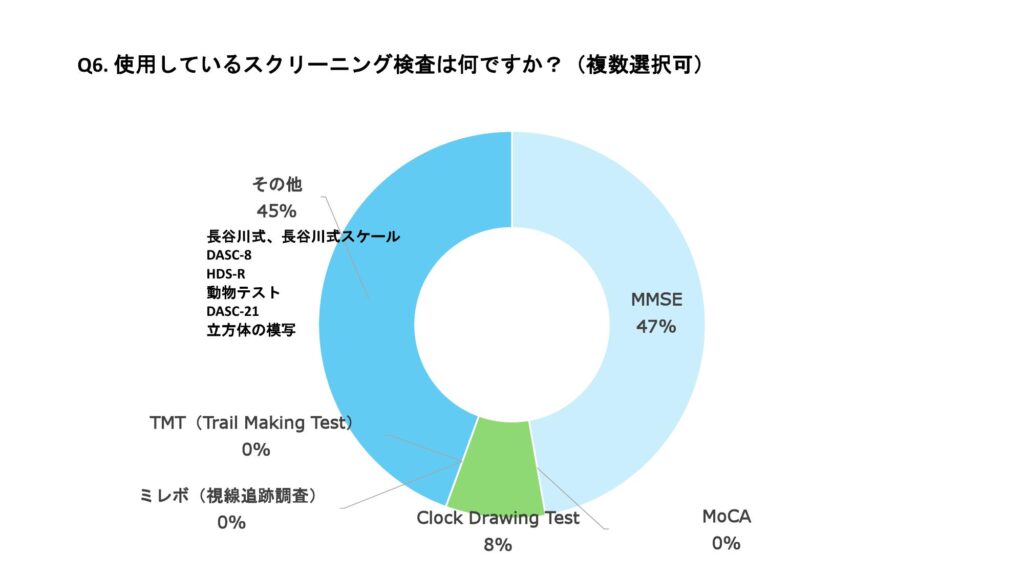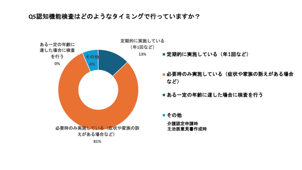 認知機能検査を実施している施設は48%であり、検査のタイミングとしては81%が「症状や家族の訴えがあった場合の必要時」に実施していた。一方、「年に1回定期的に実施している」と回答した施設は13%であった。使用されているスクリーニング検査には、MMSE,長谷川式、DASC-8、立方体の模写、clock drawingなどが挙げられた。 - 認知症が疑われた場合の対応