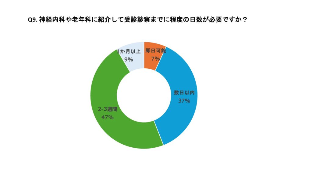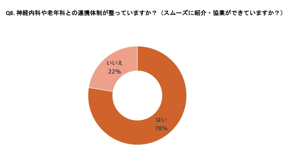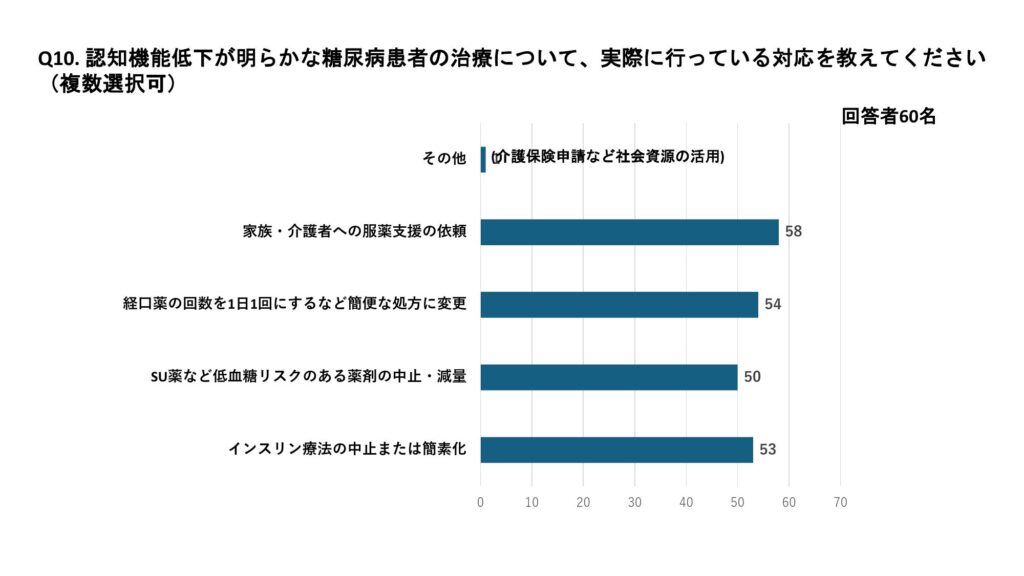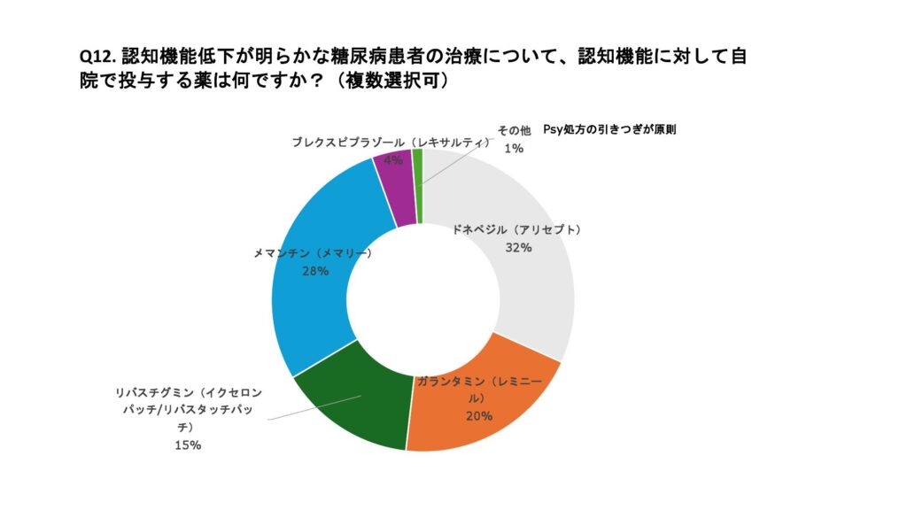 認知症の確定診断に際し、神経内科、精神科、老年科へ紹介している施設は70%、自院で診療管理している施設は14%であった。診療体制については78%の施設が神経内科、老年科との診療体制が整っていると回答した。また、紹介から受診までの日数は、「数日以内」が37%、「2~3週程度」が47%、「即日対応」が7%であった。 認知機能低下が明かとなった患者に対しては、98%の施設がHbA1cの目標値を個別化しており、多くの施設でインスリンや経口薬の簡素化や減量、中止などの対応を行っていた。認知機能低下に対して自院で処方している薬剤はドネペジル(アリセプト)32%、ガランタミン(レミニール)20%、 メマンチン(メマリー)28%の順に多く使用されていた。 - 多職種連携・支援体制