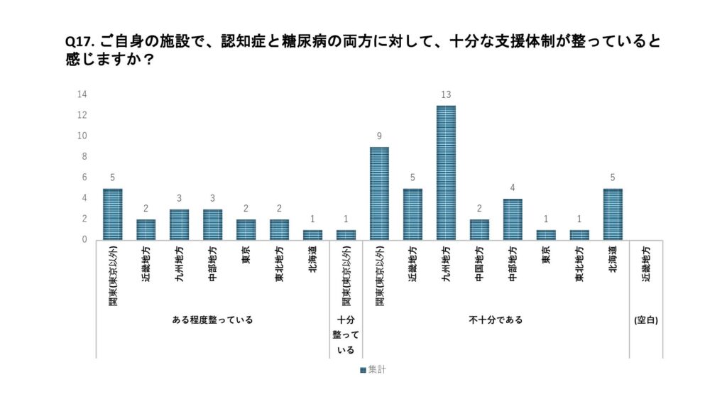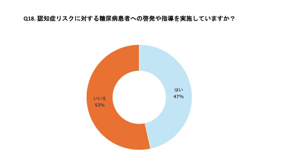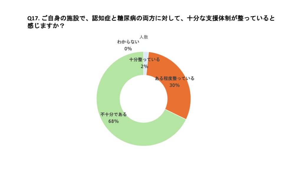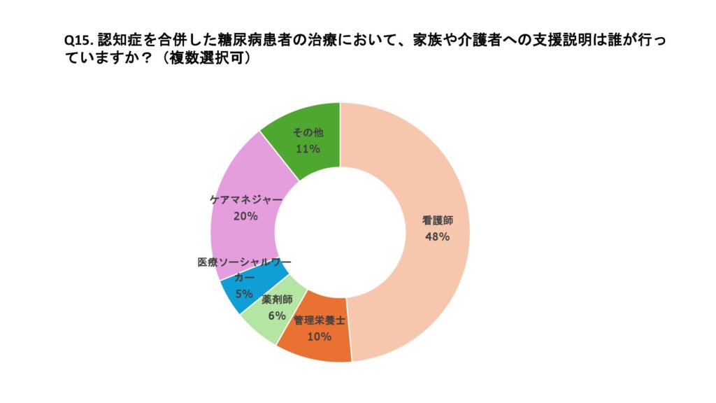 認知症患者の家族や介護者への支援説明をしている職種は、看護師が48%、ケアマネージャーが20%、管理栄養士が10%であった。支援説明については患者の変化がない場合は年1回程度、変化のある場合はその都度家族に連絡し、同伴のうえ直接説明しているケースが多かった。 自施設において認知症と糖尿病治療に対する支援体制として「十分整っている」と答えた施設は2%、「ある程度整っている」とした施設は30%、「不十分」と答えた施設は68%であった。認知症リスクに対する糖尿病患者への啓発や指導を実施している施設は47%であった - 今後の課題