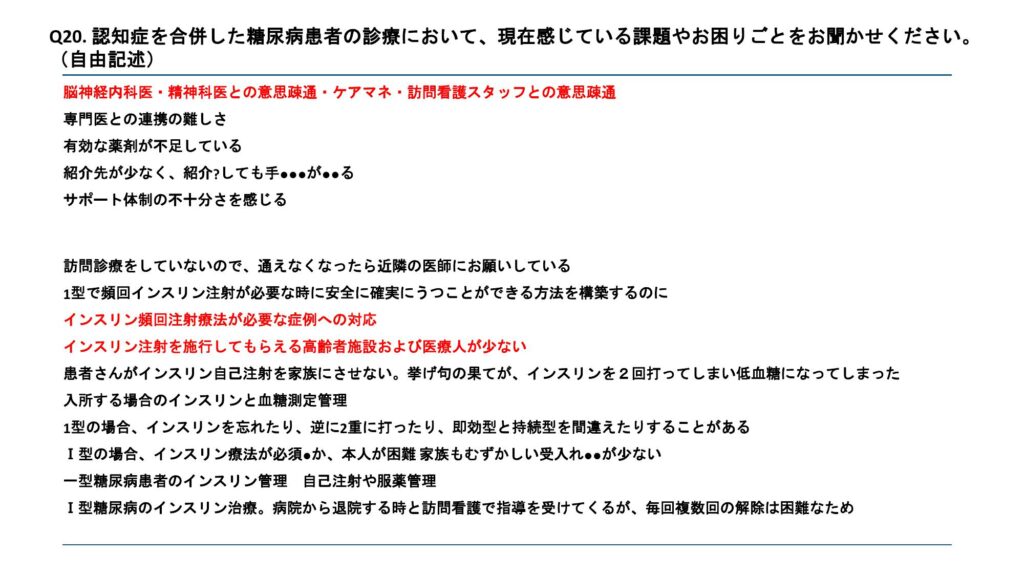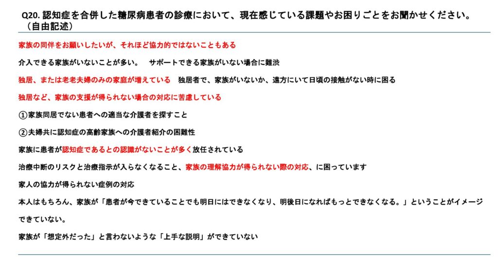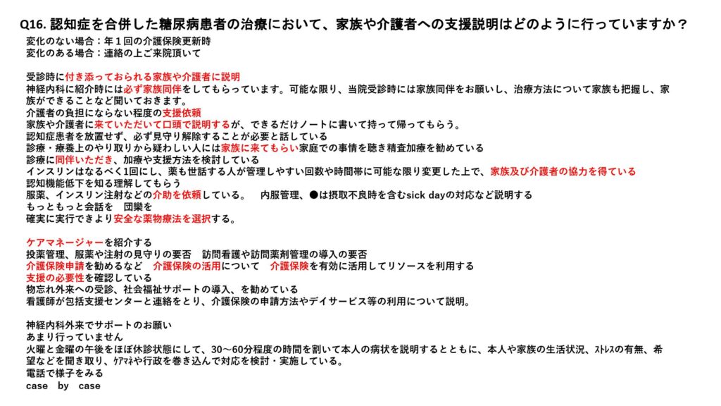 今回、全員討論のテーマとして「糖尿病患者における認知症診療に関するアンケート」を行った。その結果を発表する。